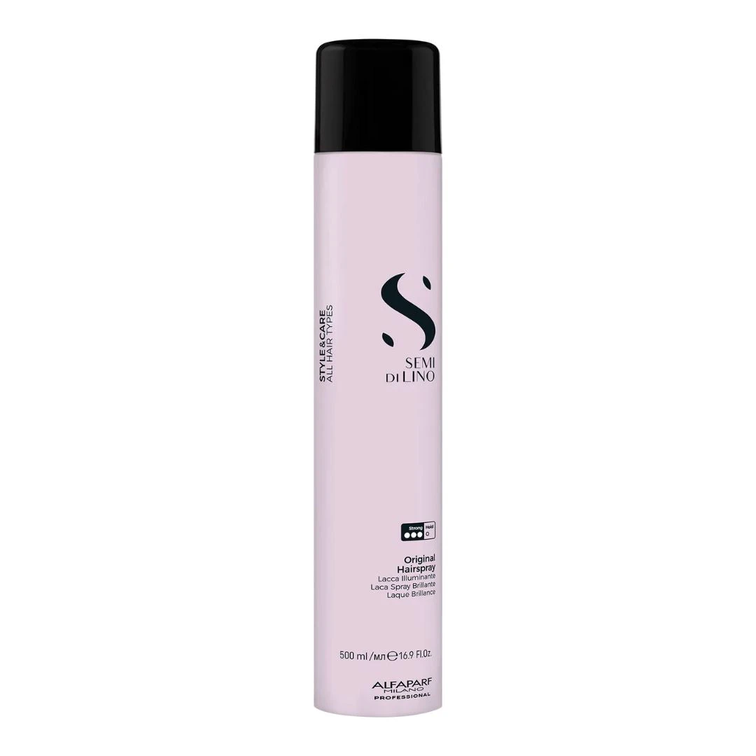Alfaparf Milano Semi Di Lino Styling Original Hairspray 500ml allows the hair to move and creates shine, without weighing it down. Strong hold. Vegan formula. Floral and fruity fragrance developed to positively influence your sensory experience. For all types.Â