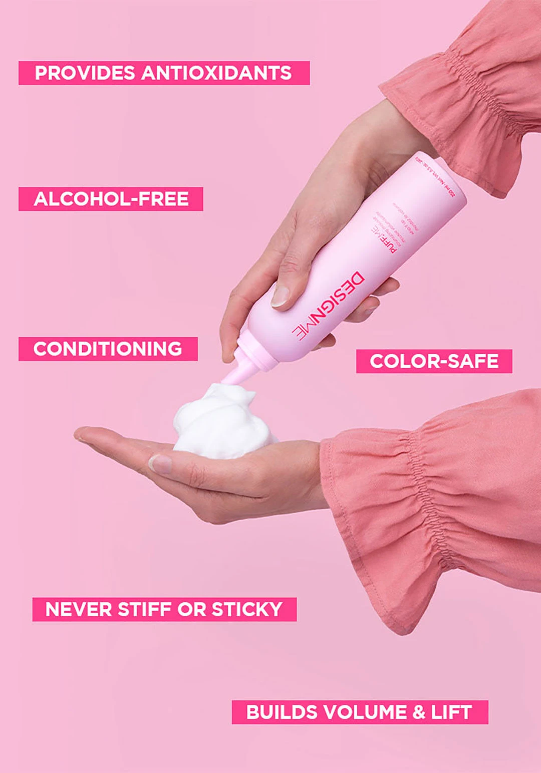 DesignMe Puff.Me Volumizing Mousse 250ml transforms hair, giving it noticeable volume & body from roots to ends. It features a lighter-than-air texture that seamlessly melts into your hair, providing long-lasting hold, without any residue or crunch. Built-in heat protection means you can add a curling iron, wand, or hot rollers for extra oomph, totally guilt free.