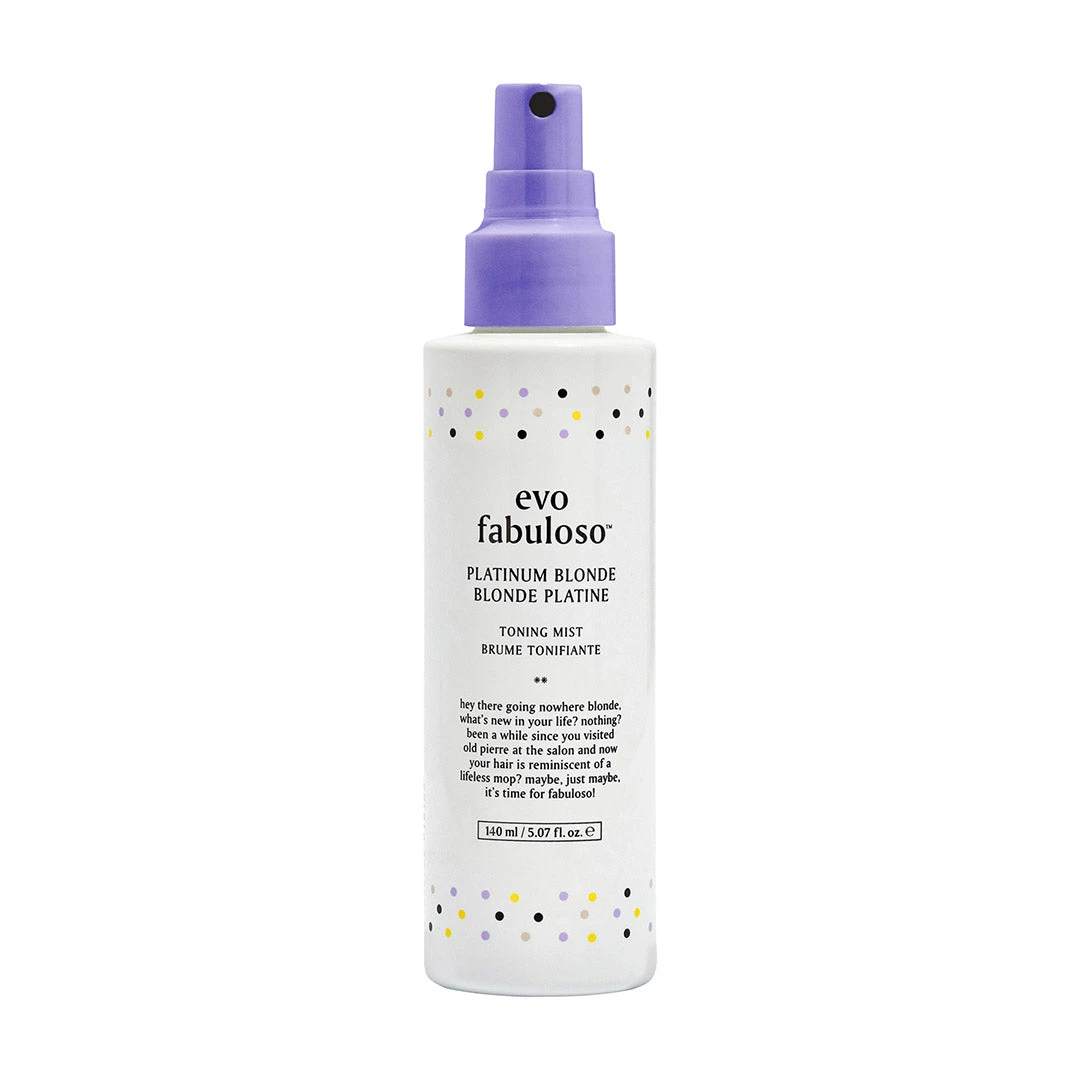 Evo Fabuloso Platinum Blonde Toning Mist 140ml is a super lightweight, leave-in spray that gently tones to keep any shade of blonde hair light and bright. It enhances vibrancy, neutralizes yellow tones, and adds shine, making it ideal for maintaining bright and healthy blonde hair.