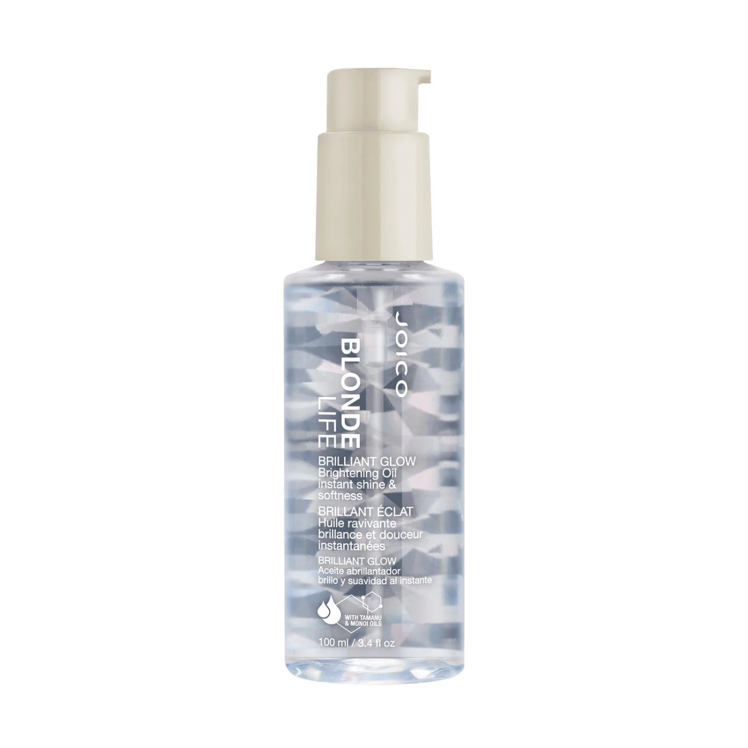 Joico Blonde Life Brilliant Glow Brightening Oil nourishes and protects each strand with a megawatt shine. Shine is magnified and blonde hair appears brighter.