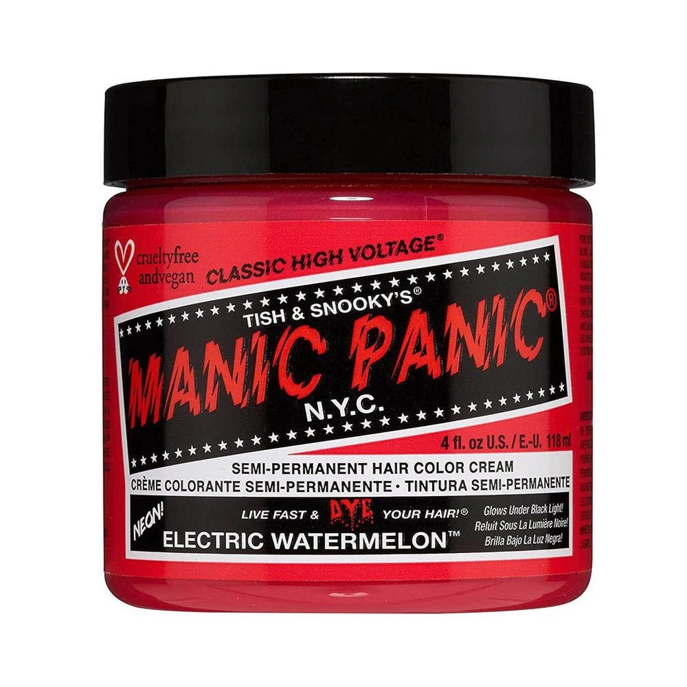 Manic Panic Classic Electric Watermelon 118ml is neon pink dye with yellow and violet undertones classic semi-permanent hair dye. Electric Watermelon glows in the dark under black light, so we recommend lightening hair to the lightest level 10 blonde before use.