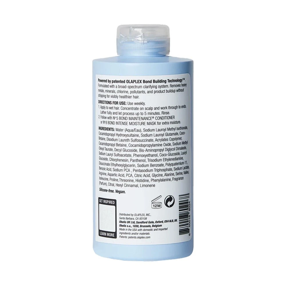 Apply shampoo to wet hair, lathering thoroughly from roots to ends. Allow to process for up to 5 minutes. Rinse well. Follow up with OLAPLEX No.5 Bond Maintenance Conditioner or No.8 Bond Intense Moisture Mask for added moisture.