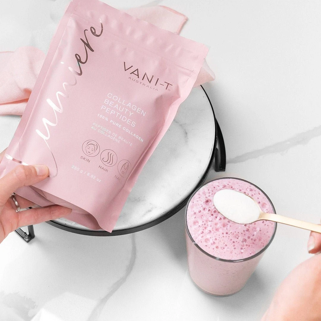 Vani-T Lumiere Collagen Beauty Peptides 250g are loved for their power to support our body’s natural functions, as well as giving our topical products a helping hand. Designed to nourish from the inside out, Lumiere Collagen Beauty Peptides packs in ingestible bioactive collagen peptides that are especially targeted at hair, nail and skin health. It’s your edible fountain of youth. 100% pure Bovine collagen.Â